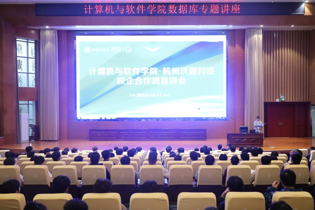 魏兴华首先介绍了沃趣科技的企业文化、发展历程、主营业务。随后以“2024数据库行业趋势漫谈”为题 ,深入剖析了国产数据库行业发展现状。王显伟对部门发展及公司用人需求进行介绍。潘飞宏对此次校企合作班具体事宜进行讲解,并对校企协同人才培养模式、培养环节等进行了详细阐述。公司数据科学与大数据专业实习生黄盛龙分享了他在沃趣科技的成长经历,帮助同学们更好的了解了企业招聘需求及未来就业发展前景,为同学们提供了针对性的建议和指导。