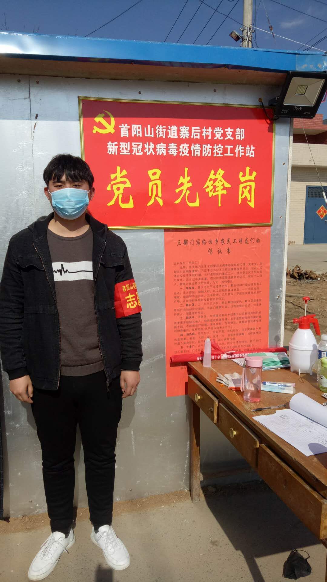 18java1班赵浩男在河南省洛阳市偃师市首阳山镇寨后村防控工作站参与疫情防控。