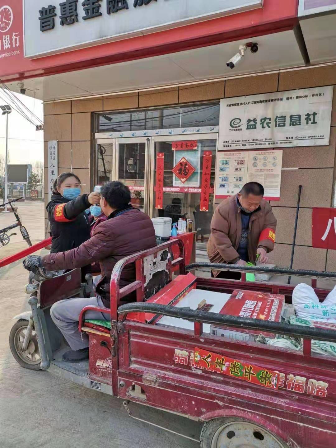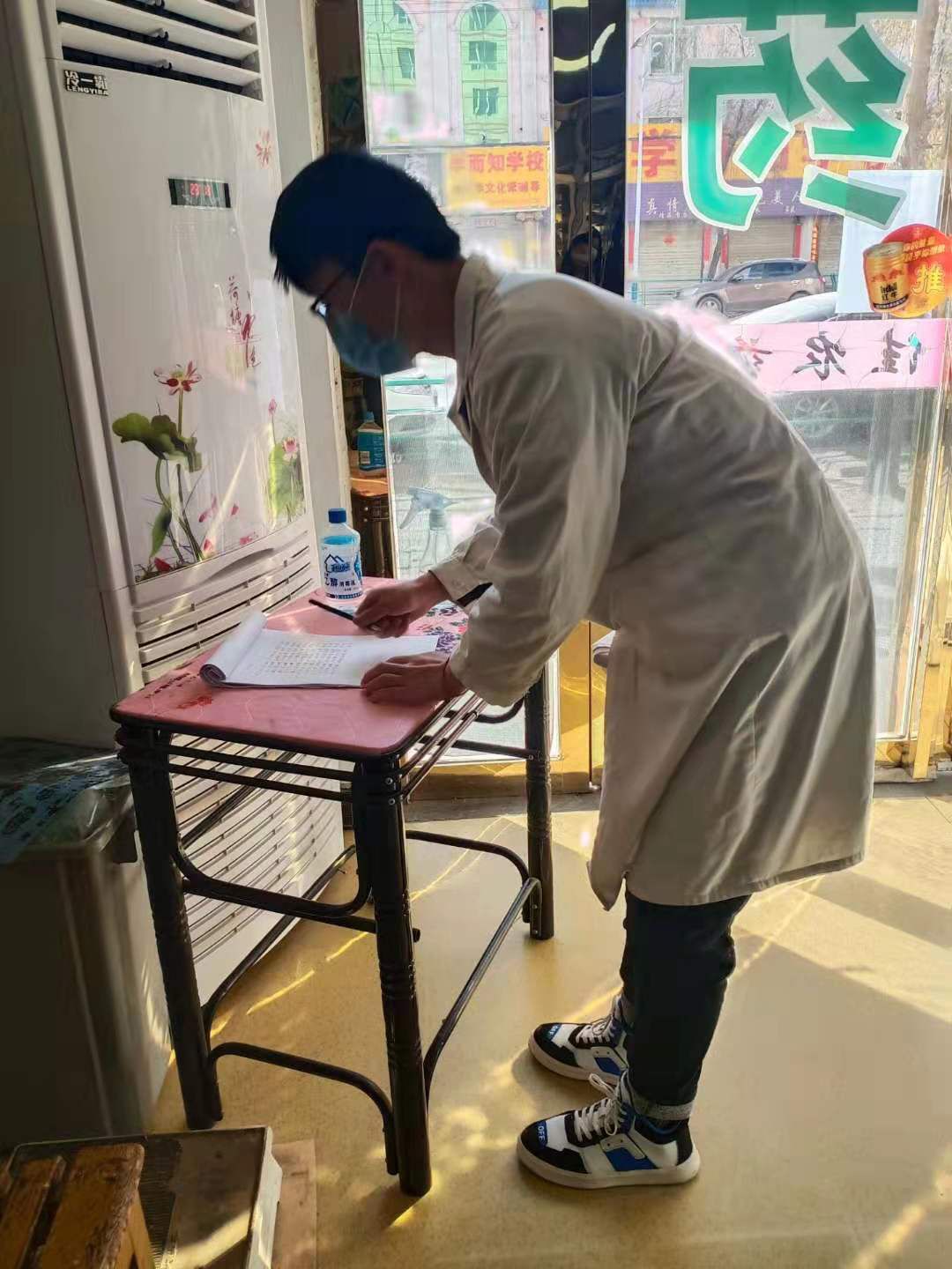 18级渗透测试1班的王澍雨在青海省西宁市湟中县多巴镇佳农医药连锁康容第四药店做志愿者,帮买药者量体温。