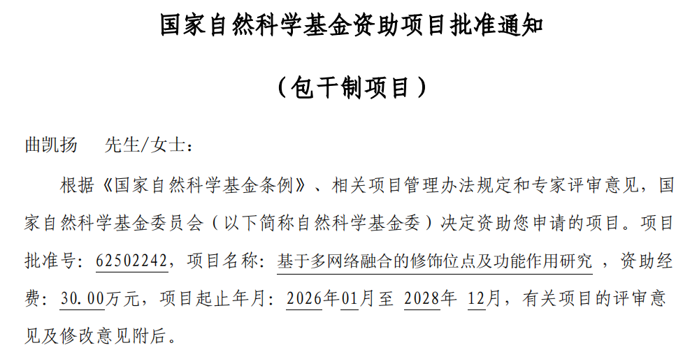 本次获批项目名称为《基于多网络融合的修饰位点及功能作用研究》。本项目综合应用生成网络、多标签深度学习、图神经网络及生物网络等多种前沿计算技术,旨在完成对修饰位点的精准预测,并深入探究位点间相互作用及其与人类疾病的复杂关联。该项目致力于研究生命健康领域的基础科学问题,旨在揭示特定修饰位点与多种重大疾病的关联,以推动个性化治疗与精准医学的发展,积极响应“健康中国”的战略号召。