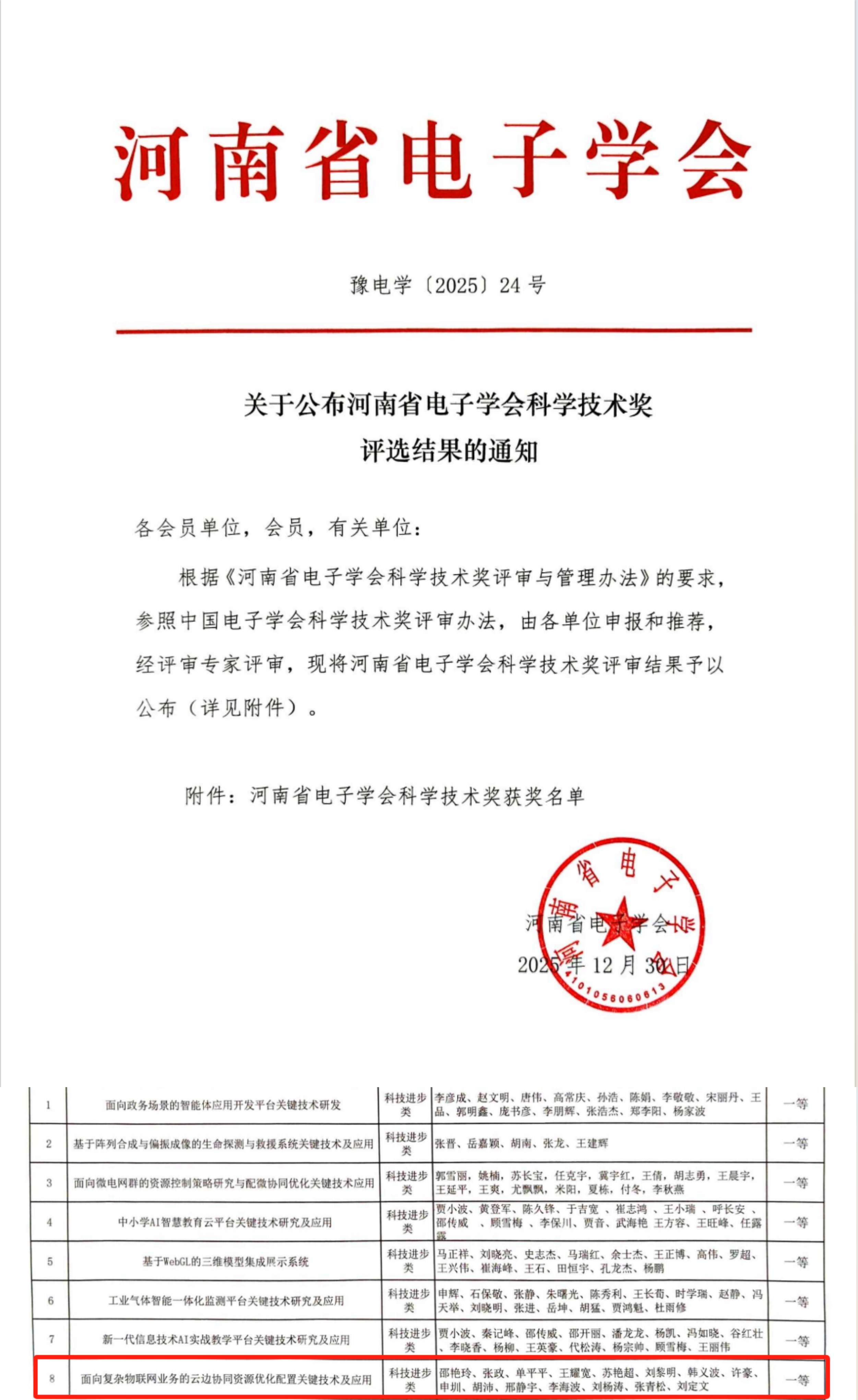 本网讯(特约记者/张政)1月28日,2025年河南省电子学会科学技术奖评选结果公布,由公司牵头申报的项目《面向复杂物联网业务的云边协同资源优化配置关键技术及应用》被授予2025年河南省电子学会科技进步奖一等奖。该项目由公司bevitor伟德国际1946邵艳玲教授团队牵头,联合湖北九州云智科技有限公司共同申报。