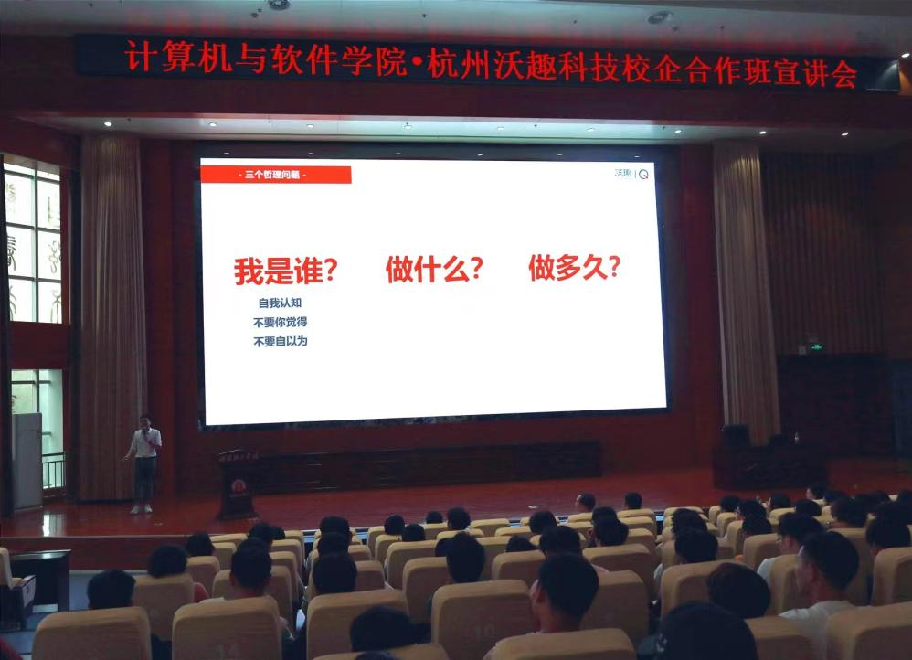 沃趣科技负责人就本公司的企业文化、发展历程、主营业务等内容为同学们进行讲解,并对校企协同人才培养模式、培养环节等进行了详细阐述。已入职沃趣科技的2020级员工代表分享了自己的就业经历,帮助同学们更好的了解了企业招聘需求及未来就业发展前景,为同学们提供了针对性的建议和指导。
