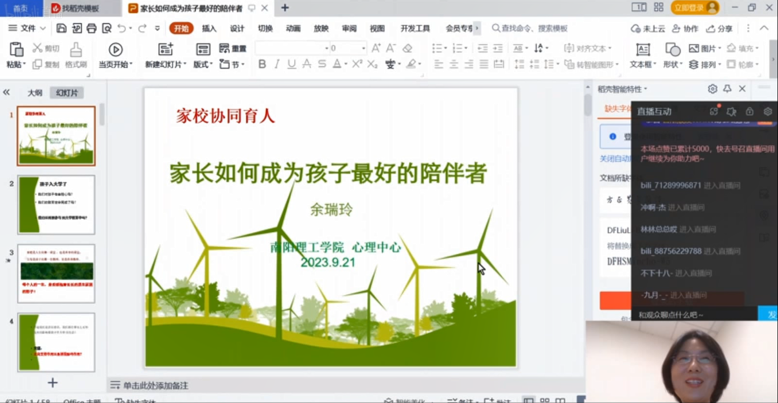 本次讲座采用线上直播的方式进行,数百名家长通过哔哩哔哩网站在线观看互动。余瑞玲主任结合当前老员工成长发展的身心规律,围绕新时代家长在家校协同育人中需要参与、参与什么、如何参与等方面进行了详细解读。