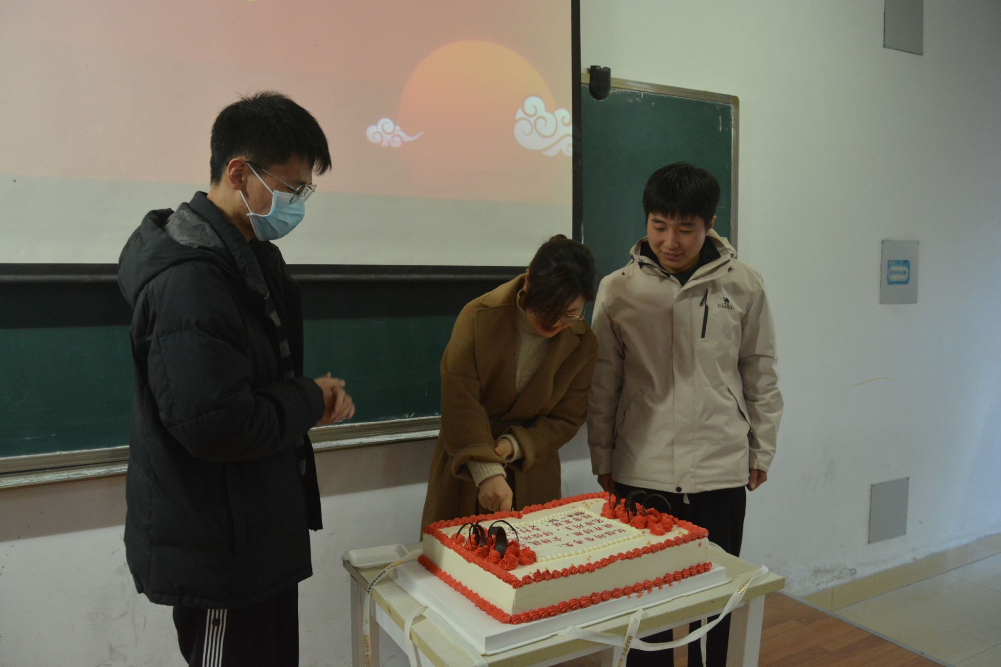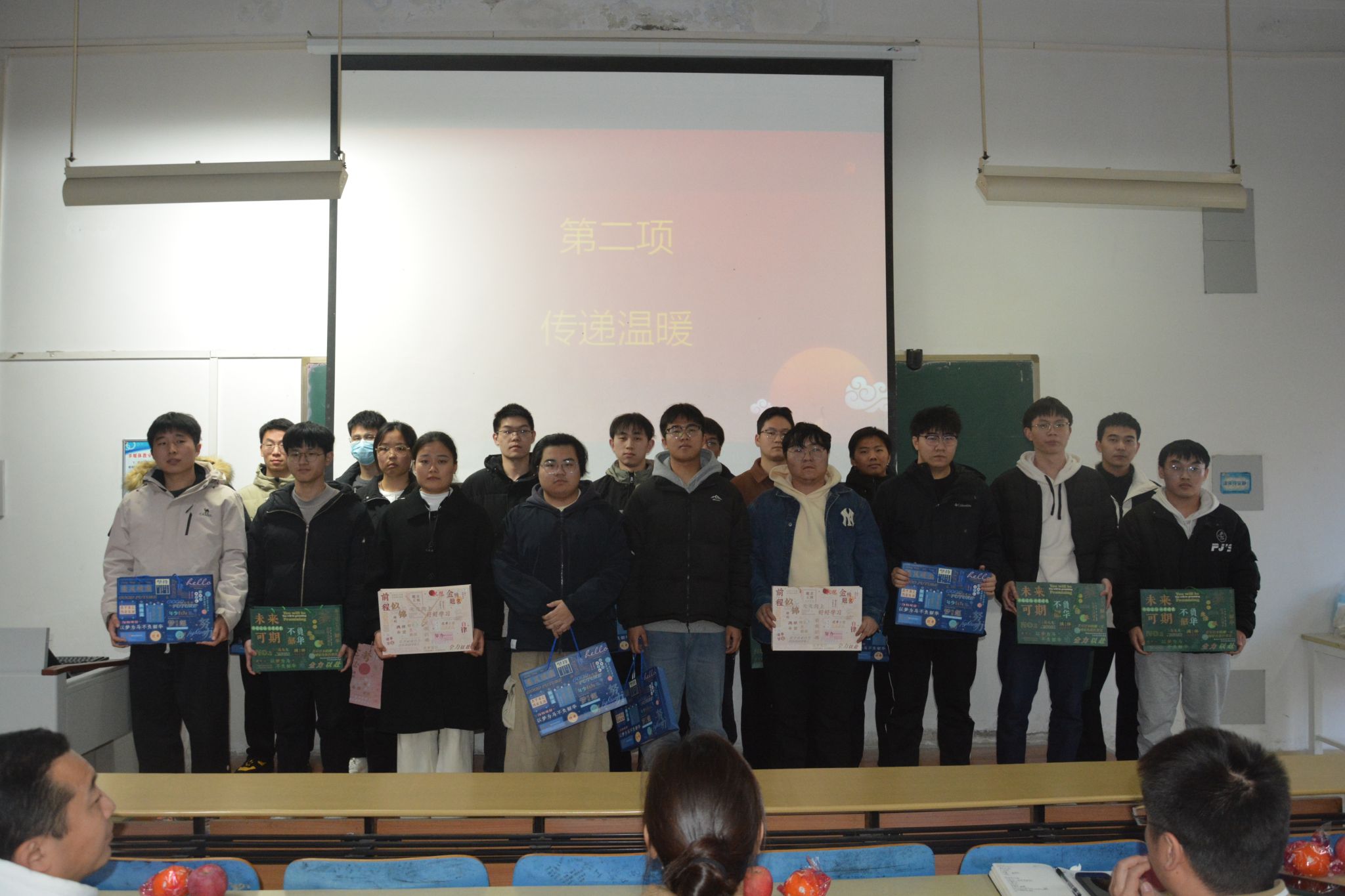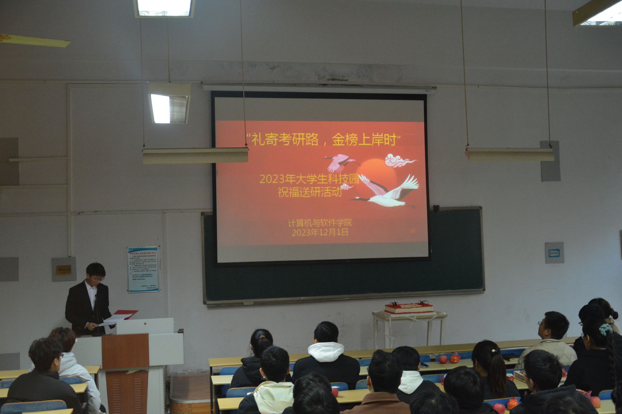 活动伊始,播放了低年级社团学弟学妹们录制的祝福视频。视频充满了他们对考研学长学姐们的深深祝福和美好期望。紧接着,由社团同学向在座的考研同学送上特别的祝福礼品,代表着他们的一份心意,祝福考研学子心想事“橙”,“苹”稳上岸。礼盒中不仅有精美的文具,更有学弟学妹们在贺卡上写下的真诚祝福,为勇于拼搏的考研学子们加油鼓劲!同时,活动播放了一段19级考研上岸的学长学姐录制的视频,分享他们考研最后这段时间的宝贵经验,送上他们真诚的祝福。19级员工是前跃码工作室的负责人王景坤,目前在北京物资学院攻读计算机科学与技术专业。随后,王豫峰老师上台,为考研的同学们送上他的祝福和鼓励。活动最后,申玮老师为考研的同学们切蛋糕,象征着老员工科技园对大家的的希望和祝福。