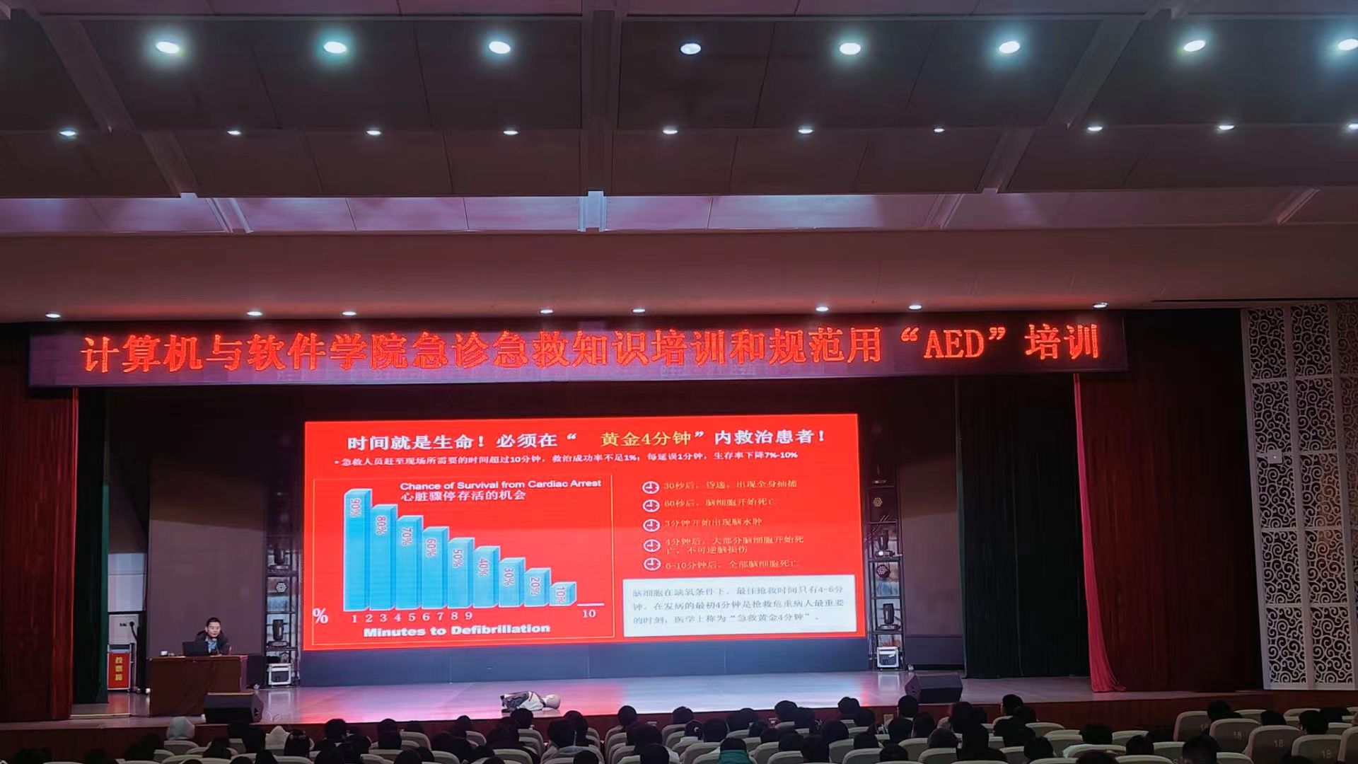 培训现场,张峻瑜利用模型道具详细讲授了心肺复苏术、AED(自动体外除颤仪)的使用方法等急救理论知识。现场演示了正确的心肺按压方法,尤其对如何在事故发生第一时间争取“黄金4分钟”,有效开展现场自救互救等作了详细讲解。随后现场参与培训的同学分小组在仿真人体上进行心肺复苏技能训练。
