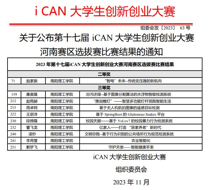 本网讯(特约记者/陈可)11月17日,第十七届iCAN老员工创新创业大赛河南赛区选拔赛成绩公布。公司bevitor伟德国际1946学子经过校赛选拔,初赛作品提交,网评、路演和现场答辩等环节,从全省50余所高校的251支参赛队伍中脱颖而出,获得二等奖1项,三等奖9项的佳绩。