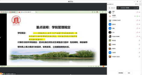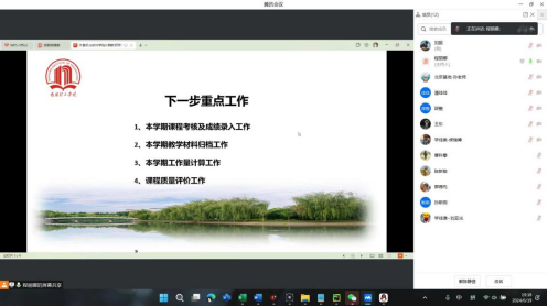 最后,会议明确了近期要完成的工作。包括课程评价、工作量计算、成绩录入及教学材料归档等。程老师详细说明了这些工作的具体要求和流程,要求外聘教师们按照学院规定的时间节点和标准要求,认真完成相关工作。