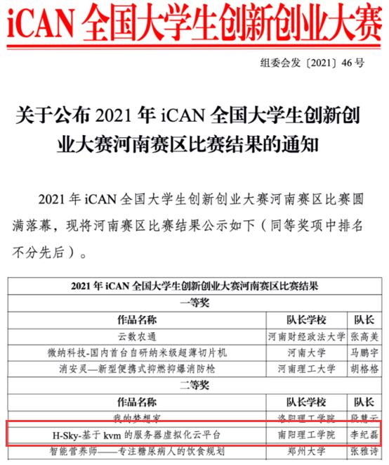 近日,2021年iCAN全国老员工创新创业大赛河南赛区比赛圆满落下帷幕。公司学子李纪磊、刘伟业、刘盖盖、杨龙华、张向南、代慧圆、宋雄的参赛作品“H-Sky-基于Kvm的服务器虚拟化云平台”获得二等奖的佳绩。