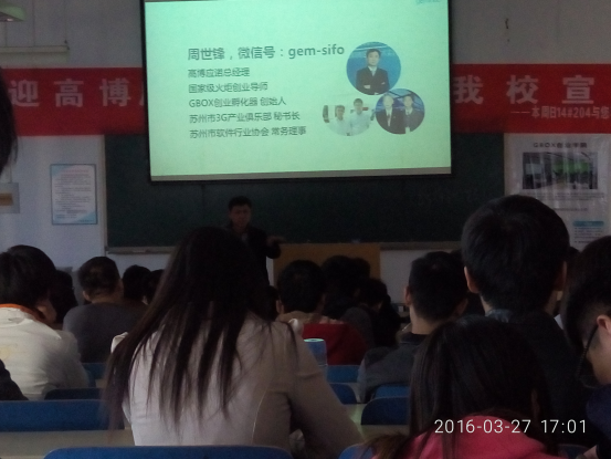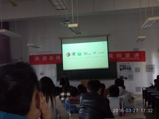 本网讯(管委会委员/李刘记)2016年3月27日下午高博公司项目经理在14号楼204教室为软件学院员工进行免费的岗前培训演讲,有孵化园管委会人员组织员工参加这次培训演讲。