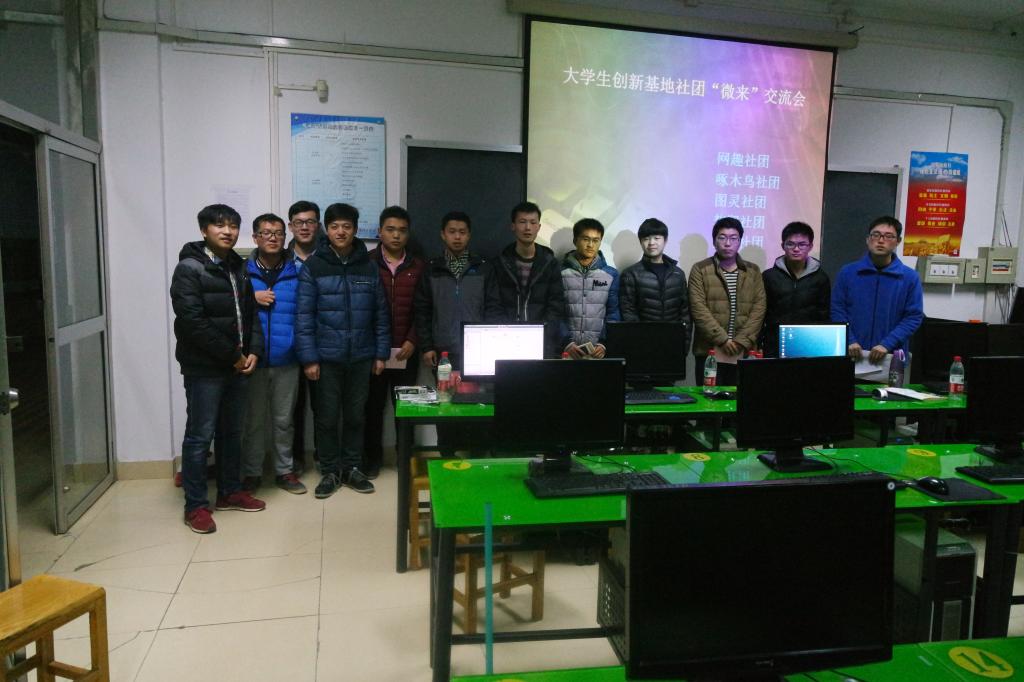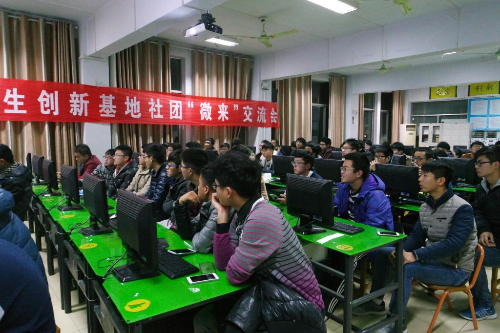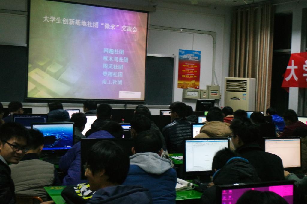2015年12月11日 19:00——21:00,由南工社团主办的老员工科技园社团“微来”交流会,在15#210实验室成功主办。主办方由南工社团主办,网趣社团,啄木鸟社团,图灵社团,梦翔社团承办。时间2小时,期间五大社团分别选出社团大三成员上去演讲。演讲完毕后,由观众提问,然后演讲者回答他们的问题,最后我们对问题提问者比较好的,给予奖励,即一人一个本子,对参与提问的同学给予一支笔的奖励。