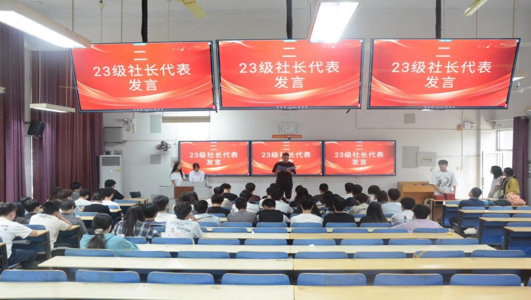 在观众的热烈掌声中,聘任仪式正式拉开帷幕。首先,22级社长代表上台发言。他回顾了担任社长一年来的难忘历程,从组织社团招新,到带领社员参与校级科技竞赛并斩获佳绩,每一段经历都饱含对社团的深厚情感。同时,他也感谢指导老师在活动策划、资源协调等方面给予的帮助,以及每一位社员的付出与支持。最后,他分享了自己在统筹管理、沟通协调中的经验,叮嘱23级新任社长在未来工作中既要坚守社团初心,也要勇于创新突破。