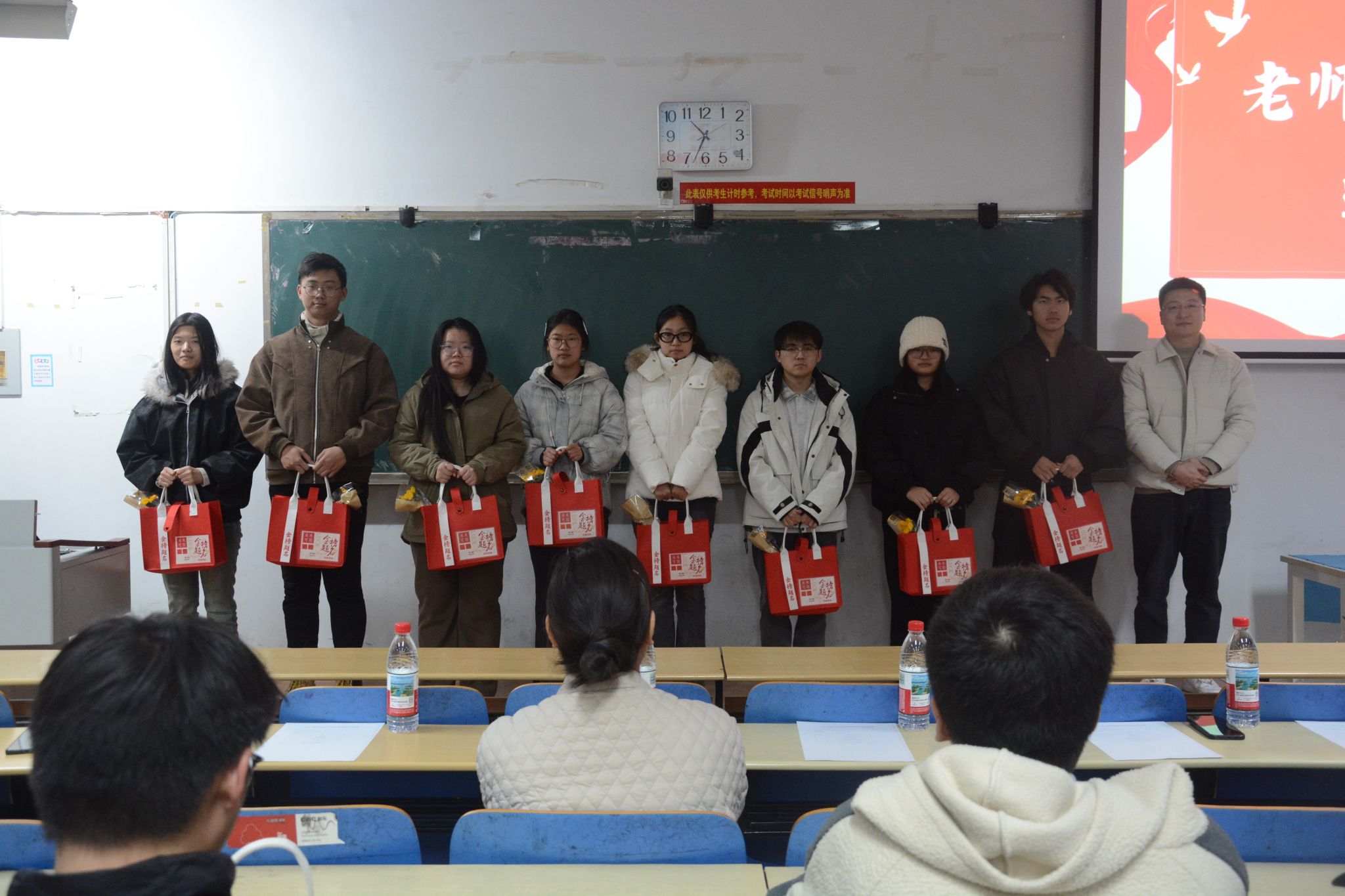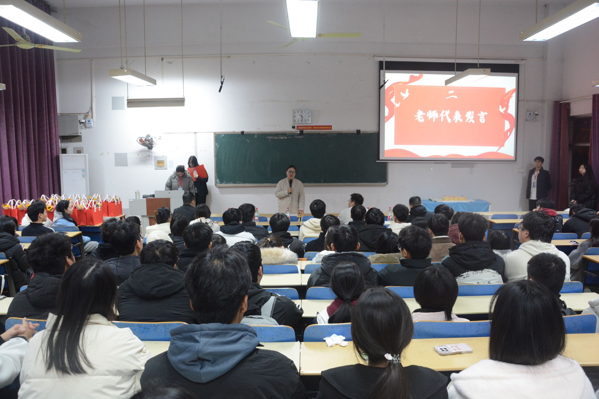 活动伊始,一段精心制作的祝福视频拉开序幕。视频中,已成功上岸的学长学姐毫无保留地分享备考心得与避坑技巧,用亲身经历为学弟学妹们指点迷津。低年级学弟学妹则以稚嫩真挚的话语送上美好祝愿,双向的温暖与鼓励让现场洋溢着满满的正能量。随后,老师代表上台送上寄语,既肯定了学子们日夜坚守的拼搏精神,也叮嘱大家在最后冲刺阶段劳逸结合、调整心态,以从容自信的状态迎战考试,句句殷切嘱托为学子们注入了强劲动力。