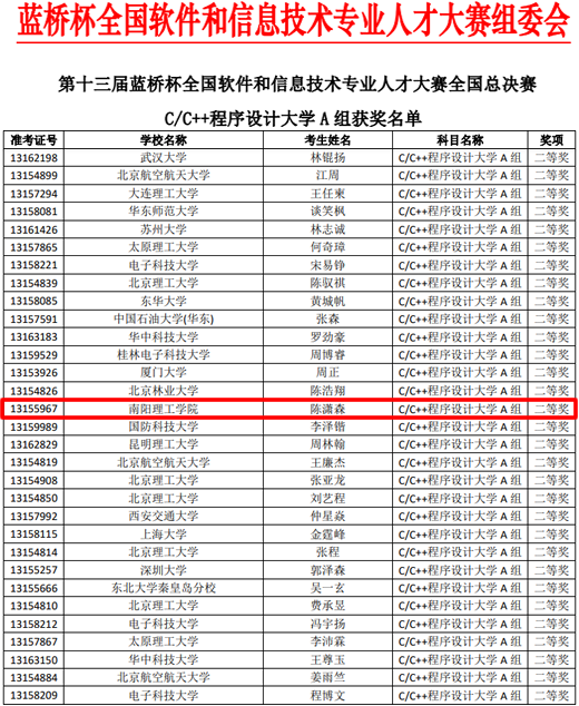本网讯(特约记者/陈可)近日,第十三届蓝桥杯全国软件和信息技术专业人才大赛全国总决赛成绩揭晓。公司学子陈潇森获得C/C++程序设计大学A组二等奖,梁儒冰获得C/C++程序设计大学A组三等奖,兰锦宇、马兵德等5名同学获得C/C++程序设计大学B组二等奖,杨鹏翼、卢梦伟等8名同学获得C/C++程序设计大学B组三等奖,焦钰龙获得单片机大学组二等奖,李浩源、蔡赛赛获得嵌入式、EDA大学组三等奖。