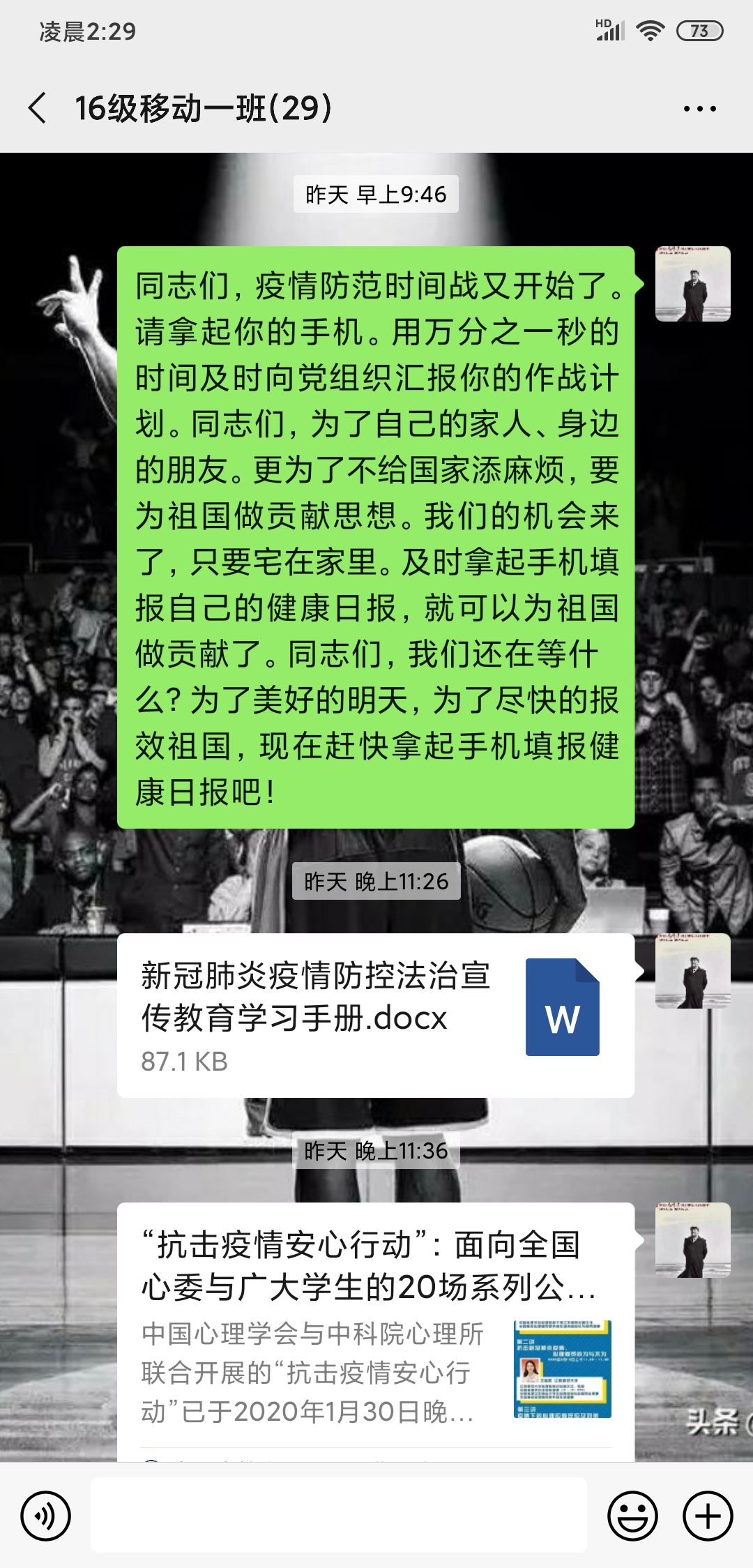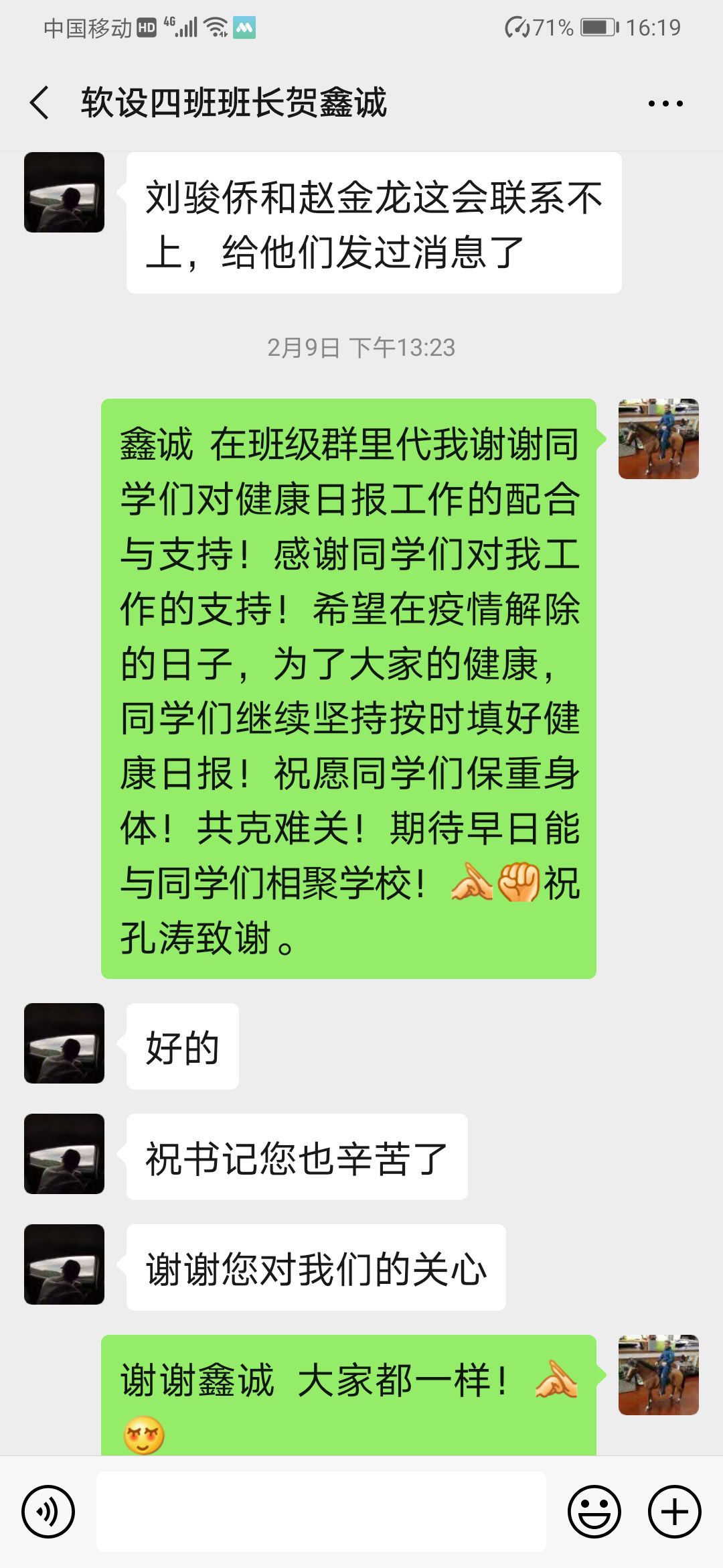 新型冠状病毒疫情,牵动着每一个中国人的心,大疫当前,疫情就是命令,防控就是责任,为做好疫情防控工作,软件学院全体辅导员在公司党委领导下,在校员工处、校团委的指导下,充分发挥示范引领作用,迅速从“假期模式”转入“战时状态”,做到守土有责、守土负责、守土尽责。一通通电话,一段段文字、一次次询问、一遍遍叮嘱、一条条宣传、一天天排查…不论身在何地、人在何方,不畏艰险、牺牲假期,奋战在防控工作前线,积极把权威的防控知识、贴心的关怀、乐观的勇气带给每一位软件学子,与他们共渡难关,共待春暖花开。