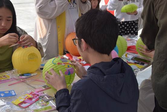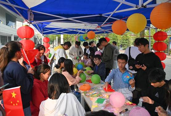 10月1日上午,齐贤广场热闹非凡,同学们围在桌前制作手工灯笼,为晚上的庙会赏灯做准备。同学们先将准备好的灯笼伸展开,各种各样的图样设计粘贴于灯笼之上,同时写下对祖国和家人的美好祝愿。