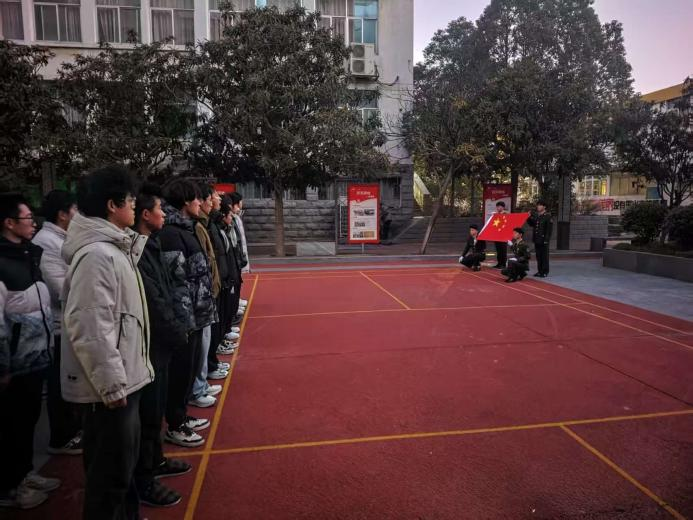 清晨微光初照党建广场,升旗仪式如期启动。两支班级学子列队整齐、静候国旗入场。随着主持人一声令下,学院退役军人协会国旗护卫队身着正装、身姿挺拔,迈着铿锵正步护送国旗走向旗杆,每一步落地都掷地有声,震撼人心。《义勇军进行曲》雄壮奏响,五星红旗冉冉升起,全体人员肃立行注目礼,齐声高唱国歌,激昂歌声穿透晨寒,在广场上空久久回荡。