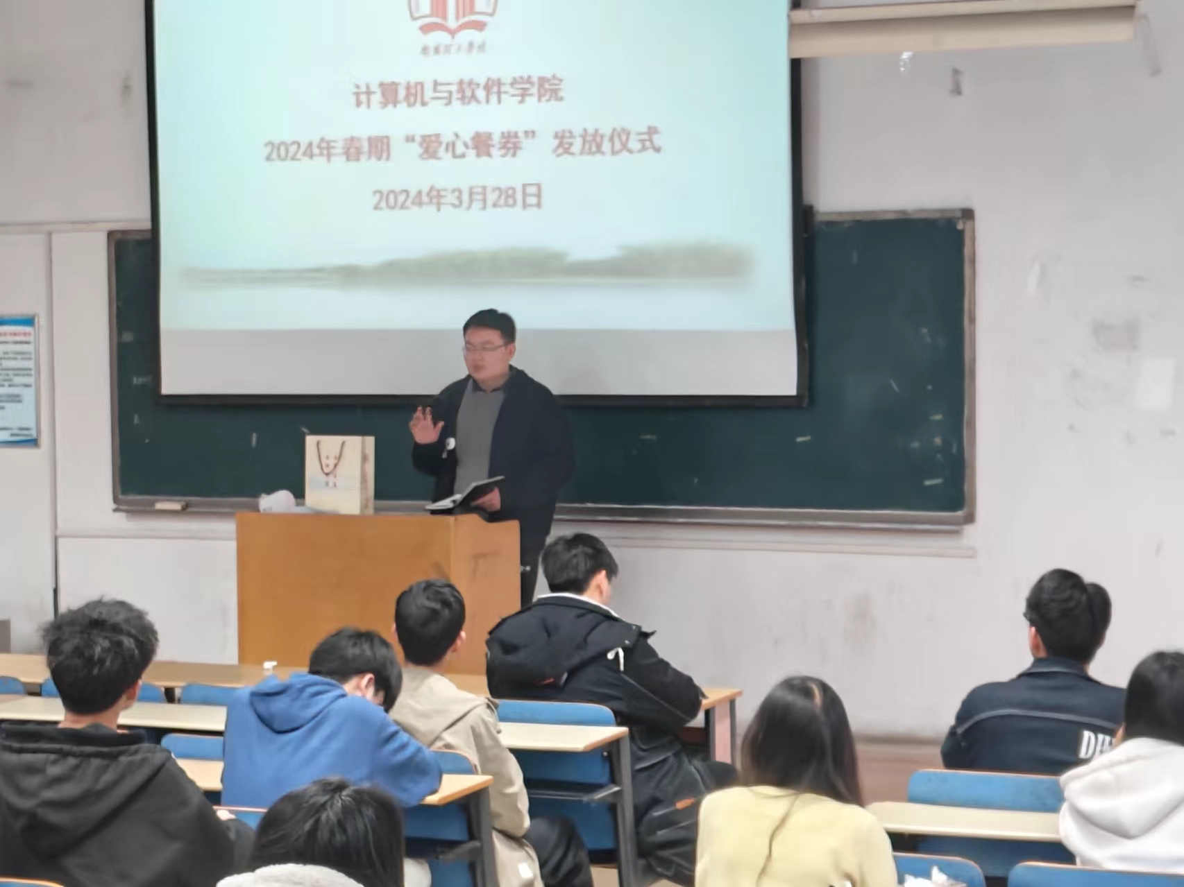 公司严格遵循公平公正原则,充分核实员工的受助条件和实际需求,以资助国家重点保障人群为主,遴选出家庭经济特别困难的员工代表共计57人,于3月28日下午在14号教学楼102教室举办2024年春期“爱心餐券”发放仪式,学院资助专干老师余帅,餐券受助员工参加。