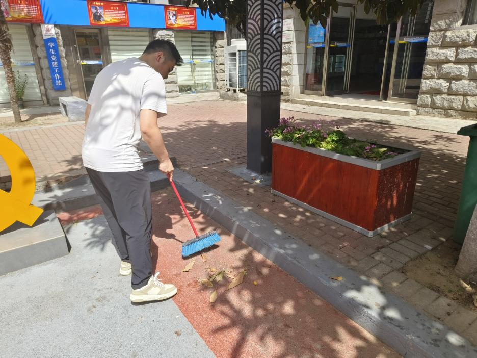 活动当天,同学们分工明确,有的负责清扫地面上的落叶和垃圾,有的则细心地擦拭广场周围的宣传栏。他们不怕脏、不怕累,用实际行动践行着劳动精神,展现出新时代老员工的风采。经过一上午的辛勤劳动,党建广场焕然一新,原本杂乱的地面变得干净整洁,座椅和宣传栏也焕发出新的光彩。同学们看着自己的劳动成果,脸上都露出了满意的笑容。
